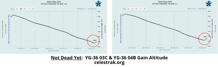 – 2 of the 7 Trail2 satellites, YG-36 03C and YG-36 04B, did increase their SMAs beginning on 17 Apr 2024. We will continue to monitor. As of 20 Apr neither YG-36 03 or 04 triplet was close to being in formation.
