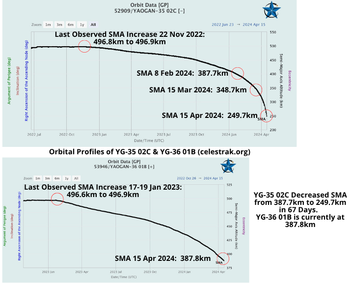 20 Apr: Yaogan-35 02C re-entered the Earth’s atmosphere just after midnight UTC on 20 April. The satellite last maneuvered in late November 2022. On 15 Mar 2024 the former “Trail2” satellite had a Semi-Major Axis (SMA/altitude) of 348.7km, one month later the satellite lost nearly 100km of altitude and was at 249.7km on 15 Apr. As YG-35 02 continued to descend it encountered more of the Earth’s atmosphere resulting in greater drag and further orbital decay. The last observation of the satellite was on 18 Apr and its altitude was just 156km. I’m also keeping an eye on YG-36 01C, another Trail2 satellite that has been slowly losing altitude. But don’t take my word for it. I ran into the one and only Jack Anthony at Space Symposium this year and we got to talking. And then Jack was nice enough to get writing, see below for his observations (which were made prior to YG-35 02’s ultimate demise).