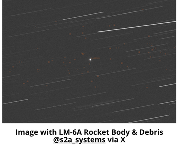 13 Apr: S2A Systems, a Swiss space domain awareness company, released analysis and images which reportedly show that the LM-6A (2024-058B) upper stage had suffered some sort of debris generating event. Per S2A’s tweet: “Images from April 7 showed nearly 60 objects around the upper stage. These are only the objects that were large enough to be detected visually with the existing setup.” Editor’s Note: I have not seen confirmation of this event in the Spacetrak.org catalog.