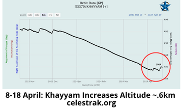 19 Apr: After months of slowly losing altitude, the Iranian operated/Russian launched Khayyam ISR satellite increased its SMA. Thanks to the tip off from Orbital Focus.