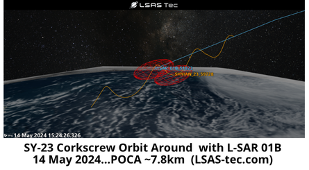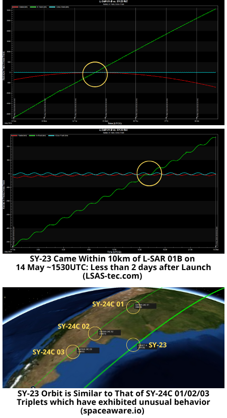 – There may not be any relationship between the SY-23 and SY-24C missions and the orbital similarities may well be purely coincidental. With their current orbital parameters the SY-24 triplets will pass SY-23 every ~22 days, the first pass occurred on 17 May 2024.