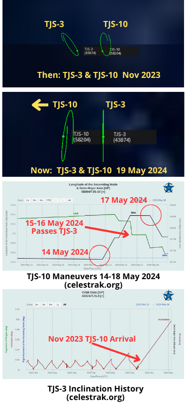19 May 2024: China maneuvered TJS-10 on 14 May and then again on 17 May increasing its altitude and initiating a westward drift. TJS-10 had been located just to the East of TJS-3 for the past 6 months. Between 16-17 May TJS-10 passed TJS-3, then slowed its drift. TJS-10 continues to drift away from TJS-3 and, at its current altitude, is moving west at .136° per day. The TJS family of spacecraft are classified Chinese military satellites associated with Signals Intelligence (SIGINT), missile warning, and “satellite inspection” missions. When TJS-10 launched on 3 Nov 2023 Chinese state media only noted the spacecraft was a “communications technology experiment.”