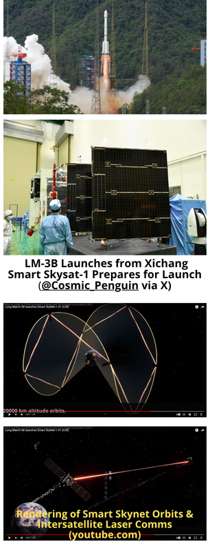 9 May: China launched a Long March-3B from Xichang containing 2 satellites destined for Medium Earth Orbit (MEO). Smart SkyNet-1 01 (A/B) satellites are “China’s first medium-orbit broadband communication satellites” and part of the “Smart Skynet” network of 8 satellites deployed into 20,000km altitude orbits. China can expand the constellation to 16 or 32 satellites. Creating a global constellation in MEO will compliment China’s plans for a 13,000 satellite constellation in LEO as well as its existing GEO satellites. Neither satellite has been reported in the spacetrack.org catalog (as of 19 May).