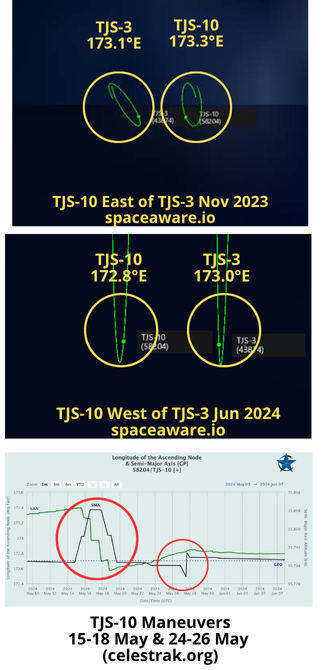 – On 22 May TJS-10 decreased its altitude a mere 1km initiating a slow eastward drift and back towards TJS-3. On 26 May it again decreased altitude another ~5km increasing its eastward driftrate until it arrived at 172.8°E. TJS-10 has made additional maneuvers to remain at that location.