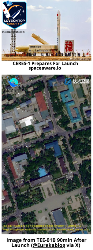 6 Jun: China’s commercial launch company Galactic Energy launched a CERES-1 rocket from the Jiuquan Satellite Launch Center with three small satellites on-board (TEE-01B, Naxing-3A and Naxing-3B). CERES-1 is a small solid propellant launch vehicle capable of delivering a 350kg payload to low Earth orbit (LEO). The upper stage of the CERES-1 rocket for this mission was equipped with an orbital test platform designed to provide low-cost on-orbit testing for new technologies, devices and products. Launch Video.