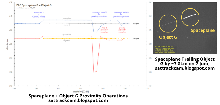 14 June: After releasing an object (affectionately cataloged as “Object G”) on 24-25 May, China’s Shenlong spaceplane initiated a series of maneuvers. Observations from Dr Marco Langbroek indicate the Spaceplane adjusted its orbit to make several close approaches with Object G between 5-7 June and again on 11-12 June. It is not known if the spaceplane re-captured Object G and then released it again. Watch Video.