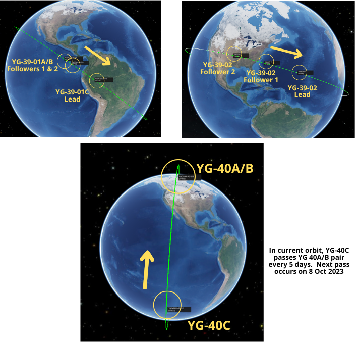 7 Oct 2023: YG-39-01A/B/C satellites appear to have maneuvered into a “typical” formation with one lead and two followers with the followers being significantly closer to one another than the lead satellite. YG-39-02 appears to remain spread out with roughly equal distance between the three satellites. YG-40C continues to maintain a lower orbit than YG-40A & 40B and has passed its sister satellites twice. Expect YG-40C to raise its orbit at some point to create a nearly equilateral triangle formation similar to the YG-31 family.