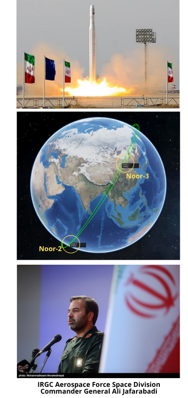 27 Sep 2023: Iran (specifically the Iranian Revolutionary Guard Corp <IRGC>) successfully launched its third reconnaissance satellite, the Noor-3, using the three-stage Qasem rocket from Shahroud. Noor-3 is in a similar orbit with its predecessor, Noor-2. The IRGC’s Space Commander praised the Noor-3 satellite’s image accuracy, claiming it had twice the image accuracy of Noor-2. Launch Video.
