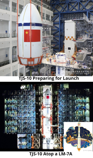– TJS-10 is the first TJS satellite to be launched by the LM-7A and the Wenchang launch facility. China launched all previous TJS satellites using the older LM-3B (one instance of a 3C), and all launches were from Xichang.