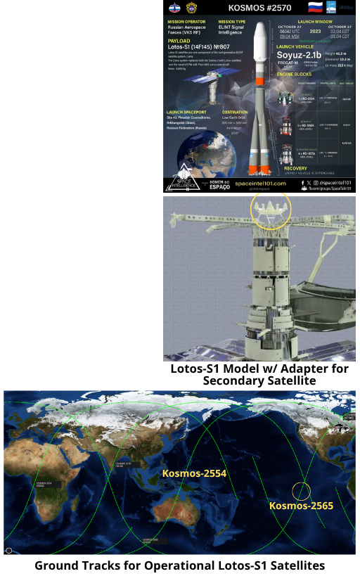 27 Oct 2023: A Soyuz-2-1b rocket lifted off from Plesetsk, likely carrying a classified payload known as Lotos-S1 no. 7 or 14F145, and a secondary payload. It is the eighth addition to the Liana constellation, performing electronic intelligence from space for the Russian armed forces. The satellite, now labeled Kosmos-2570, deployed a small subsatellite (Kosmos-2571), after circularizing its orbit. Launch Video.