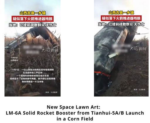 31 Oct 2023: China launched a modified LM-6A from Taiyuan Satellite Launch Center carrying the Tianhui-5A and 5B remote sensing satellites. According to official sources, the satellites entered their intended orbits and “will be used for geographic mapping, land resource survey, scientific experiments and other missions,” Launch Video.