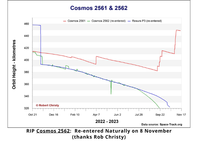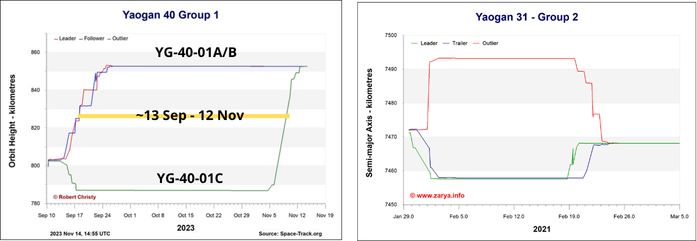 13 Nov: China increased the altitude of Yaogan-40C to match that of Yaogan-40A and 40B. The three satellites are now in formation and likely performing their radio collection and geolocation mission. China launched all three satellites on 10 September and shortly afterward increased the altitude of 40A and 40B while decreasing the altitude of 40C. As noted by Robert Christy, this maneuver pattern is similar to the deployment of the Yaogan-31 satellites.