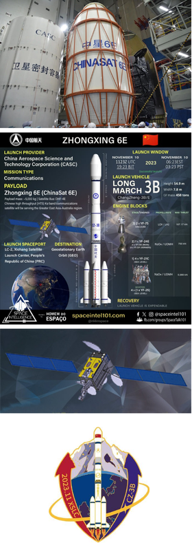 9 Nov 2023: China launched a Long March 3B/E from Xichang Satellite Launch Center. Chinasat-6E (Zhongxing-6E) was in geosynchronous transfer orbit (GTO) until 17 Nov when it circularized it’s orbit at 129.8°E near Chinasat-6C. Chinsat-6E will provide radio and television broadcasting service. Launch Video.