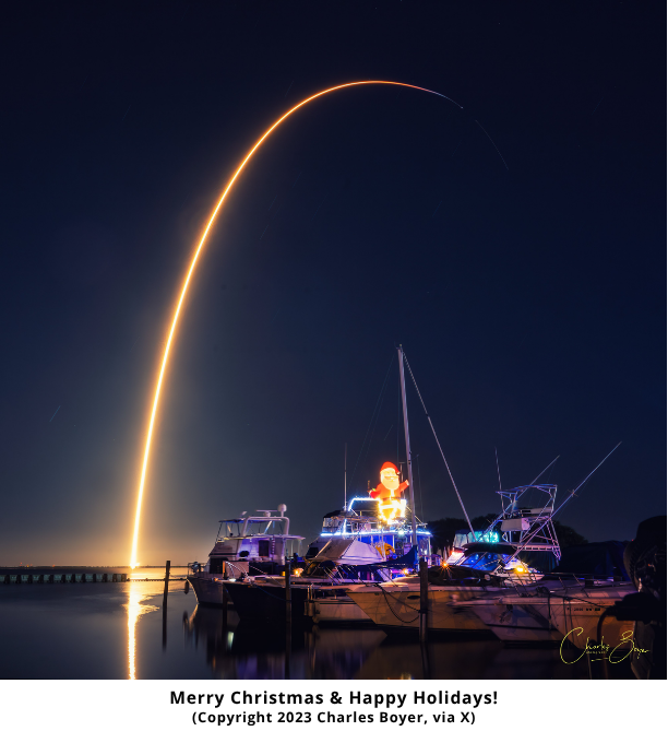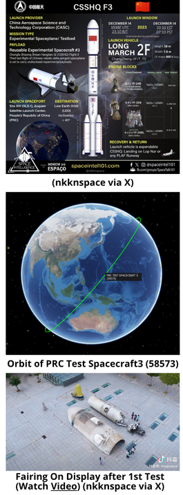 14 Dec 2023: China launched its Shenlong (Divine Dragon) spaceplane using a LM-2F from Xichang. The winged vehicle reached a 332.9 x 347.9 km orbit, with a 49.99° inclination. There was speculation Shenlong released up to six objects, and that some of these were transmitting radio signals. This has not been confirmed, and other observers have noted the standard LM-2F launch typically generates six objects: payload, rocket stage and four fragments, with expected deviations in height/period and inclination – usually described as solid motor cover separation. No Launch Video released, however there is an amazing