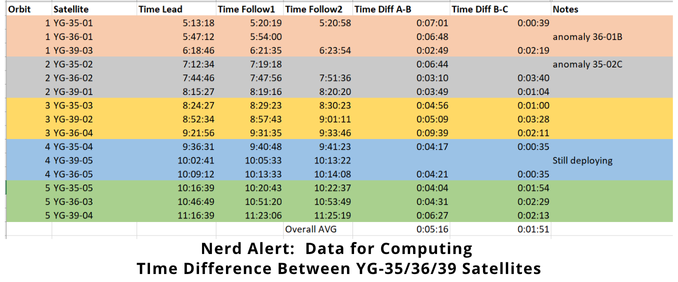 – Spacing: 9 of the 15 of the YG-35/36/39 triplets operate in a similar Lead-Trail-Trail formation, with the lead satellite being considerably further ahead than the two followers.