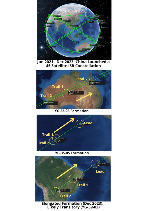 -Three of the trios (YG-36-02, YG-39-02 & YG-39-03) appear to have an elongated formation with nearly equal distance between all three satellites. China is potentially experimenting with different spacing to optimize performance.