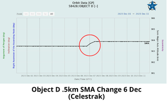 13 Dec: As noted previously, Russia launched Kosmos-2570 (58148) on 27 Oct 2023. This spacecraft is the Lotos-S1 No7 electronic intelligence satellite, and as predicted in open press, there was a secondary payload (Kosmos-2571) released 30 Oct 2023 after Kosmos-2570 circularized its orbit. Later Kosmos-2571 (58172) released “Object D” (58428). There is still confusion over naming assignment. Kosmos-2571 has not maneuvered, while “Object D” appears to have increased its altitude 0.5 km on 6-7 December.