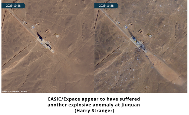 29 Nov: Commercial imagery revealed an explosion at Jiuquan. China made no announcement, but it appears likely to have involved CASIC/Expace, and either a KZ-1a or KZ-11 rocket.