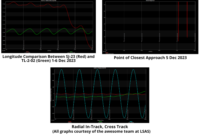 2 Dec 2023: SJ-23 increased its altitude ~45 km and initiated a westward drift. SJ-23 had been located at 171.4° E, just to the East of the Chinese Tianlian-2-02 Data Relay Satellite (which has been located at 171.0° E since it arrived at GEO in Jan 2022). As SJ-23 moved westward there were two “close” approaches on 5 Dec 2023; the first the two satellites came within ~25 km, the second resulted in the satellites came within ~40 km of one another. Chances of collision were minimal and there does not appear to be additional maneuvering other than the altitude change. As of 8 Dec SJ-23, remained at its higher altitude, was at 168.9°E and continuing to move westward at ~0.6° per day. Watch LSAS Video recreation.