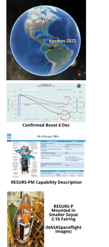 25 Nov: Russia launched a Soyuz-2-1b rocket from Plesetsk. but did not provide any description of the payload. Cataloged as Kosmos-2572, analysts initially believed it to be a new Bars-M imagery satellite. Yet there is growing evidence this is the first phase of the Razdan project. As of 3 Dec, Kosmos-2572 is in a 309 x 290 km orbit with an inclination of 96.6°. At its current altitude, Kosmos-2572 is likely capable of high resolution imagery, perhaps <0.3m. The satellite appears to be settling into its operational altitude after an