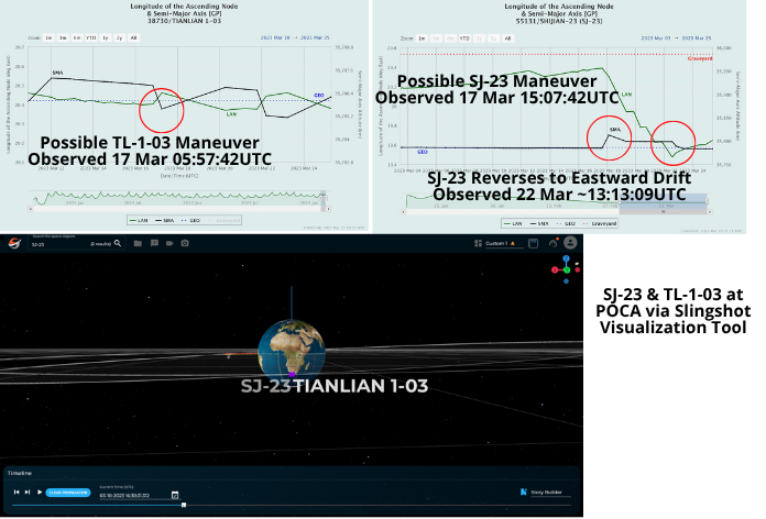 18 Mar 2023: It appears SJ-23 had a Point of Closest Approach (POCA) of 3.537kms with the Chinese Relay Satellite TL-1-03: 3.537 km on 18 Mar 2023 at 16:38:42 UTC. Information courtesy of the Palski Space Domain Awareness Report.