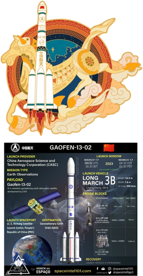 17 Mar 2023: China launched a Long March 3B from Xichang and successfully sent the Gaofen-13 (02) satellite into geosynchronous transfer orbit. CASC announced only that GF-13-02 was a high-resolution, high-orbit optical optical remote sensing satellite with great significance to the development of China’s space technology. GF-13-02 joins Gaofen-13-01 (2020) and Gaofen-4 (2015) as other optical satellites in GEO. Launch Video.