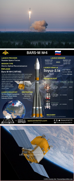 23 Mar 2023: Russia launched a Soyuz-2.1a rocket with likely a Bars-M reconnaissance satellite (now renamed Kosmos 2567) into Sun-synchronous orbit. The Soyuz lifted off from the Plesetsk Cosmodrome. Launch Video.