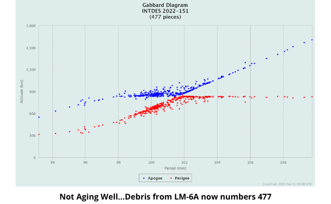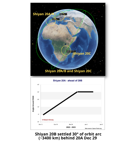 5 Jan 2023: China has maneuvered Shiyan-20A and Shiyan-20B into a lead-trail formation with Shiyan-20A 30 degrees ahead of 20B. The maneuver appears to have concluded on or about 29 December, 10 days after the pair’s 19 December LM-4C launch. The satellites began maneuvering on 14 December but on Dec 29 SY20A synchronized period with SY20B. The capabilities and mission of both satellites remains a mystery. For its part, Shiyan-20C is “twisted” 60 degrees from SY-20A/Bs’ orbital plane.