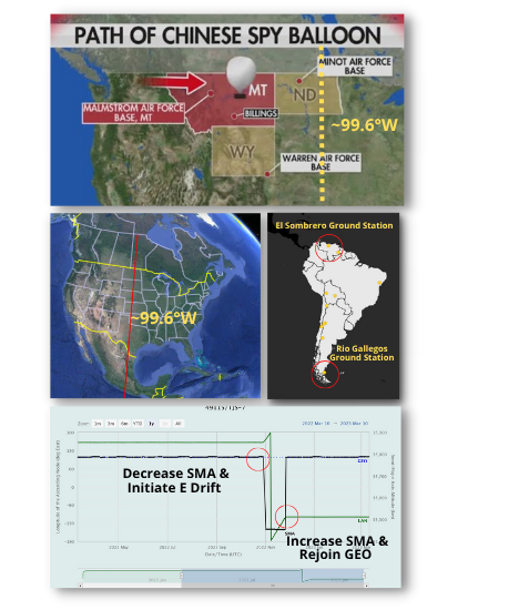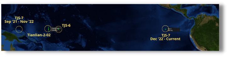 11 March 2023: While a Chinese spy balloon crossing the northern tier of the US captured the fascination of many, another Chinese object parked over the US’s (and Canada’s for that matter) geographic center line since early Nov. Little is known about China’s TJS-7 spacecraft, other TJS labeled spacecraft are believed to be SIGINT collection platforms while others are thought to be Early Warning satellites similar to the US Space Based Infrared System (SBIRS). What is known is that TJS-7 is now parked at 99.6° west longitude. It is the only Chinese GEO satellite over the western hemisphere.