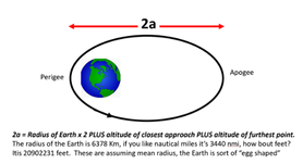 Semi-major axis “a” is the only COE that is a distance, s in km, feet, nautical miles, you can use furlongs if you want…km is the most popular and you’ll see we use a Gravitational Constant number that uses km. Here’s an illustration showing you that “2a” is the measure of the major axis or long axis of the orbit. Now, while semi-major axis is a nifty number to know, let’s see what insight it provides into the orbit’s characteristics.