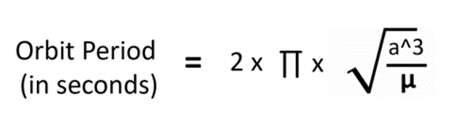 Semi-major axis is the “orbit energy” parameter, if you add or subtract velocity in-track, you change the semi major axis, you also change eccentricity, more on that next time. Thus by changing “a”, you change the energy of the orbit. Let’s do an example, Let’s say the semi major axis of a circular orbit is 7,000 KM (mean altitude 622 Km), what can we tell about the orbit? Let’s see how we can use a simple equation to find how long an orbit takes, that’s called the Orbit Period. OK, we’re going to do a little math here, relax, it’s easy. First, let me introduce the Earth’s Gravitational Parameter denoted Greek “µ.” It’s value is 398,600.4 km^3/sec^2. It’s a constant and it’s in the equation for determining the Orbit Period, how long it takes to orbit the Earth once. Here’s the equation: