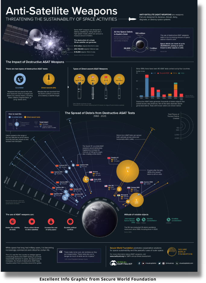 – Under Vladimir Putin, Russia reinvigorated their political desire to obtain counterspace capabilities for the same reason as China – to advance its regional power and limit the ability of the US to counter Russia’s freedom of action.