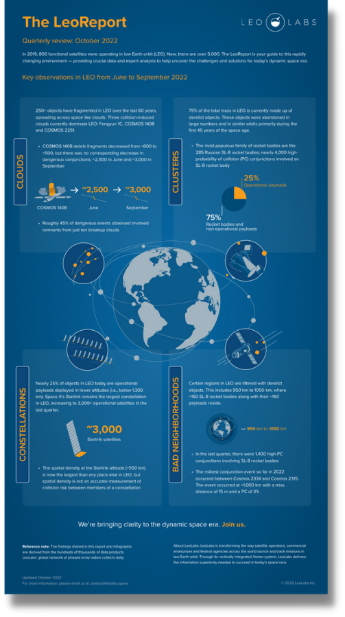18 Oct 2022: LEO Labs released its quarterly LEOReport covering Jun-Sep 2022. The LEOReport examines LEO “Clouds,” “Clusters” and “Constellations,” with a bonus section called “Bad neighborhoods.”