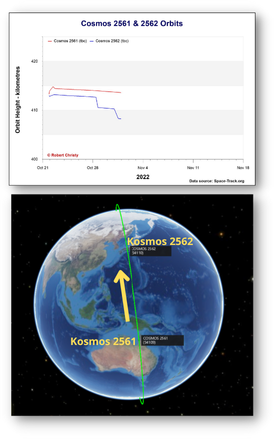 31 Oct 2022: Russia launched 2 possible inspector satellites (Kosmos 2561 and 2562) on a Soyuz 2.1b on 21 Oct. Kosmos 2562 decreased its altitude on 28 Oct and again on 31 Oct. Both maneuvers were about 2.5km. The mission of this satellite pair remains a mystery.