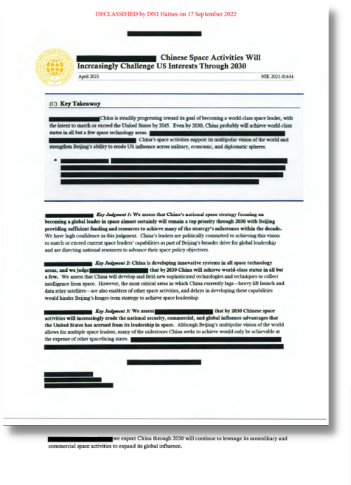 28 Oct 2022: US Director of National Intelligence, Avril Haines, declassified a short overview of China’s progress in space operations. Bottom Line: “China is steadily progressing toward its goal of becoming a world-class space leader, with the intent to match or exceed the United States by 2045. Even by 2030, China probably will achieve world-class status in all but a few space technology areas…we expect China through 2030 will continue to leverage its nonmilitary and commercial space activities to expand its global influence.”