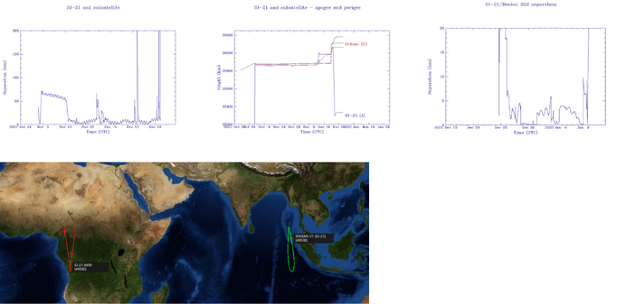 1 Jan 2022: The SJ-21 satellite launched in October released a subsatellite on around 1 Nov and performed rendezvous maneuvers to stay close to it until Dec 26, when the main SJ-21 satellite maneuvered into an elliptical orbit. The Sub-satellite is now above the GEO belt and traversing west. After ending its stationkeeping with its subsatellite, SJ-21 made rendezvous with a defunct Beidou navigation satellite from 26 Dec – 8 Jan.