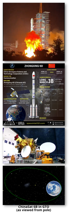 15 Apr 2022: China successfully launched the ChinaSat (Zhongxing) 6D satellite into geostationary transfer orbit via their Long March (Chang Zheng) 3B/E rocket from Xichang Satellite Launch Center. The CZ-3B/E rocket is the most powerful of the Chang Zheng 3 series China uses for most of its geostationary satellite launches. See Video.
