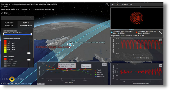 17 Mar 2022: LEO Labs analysis indicates SJ-6 05A and 05B setup for rendezvous and proximity operations (RPO) in February. LEO Labs then detected ingress maneuvers over several weeks which resulted in periods of apparent rendezvous mid-March.