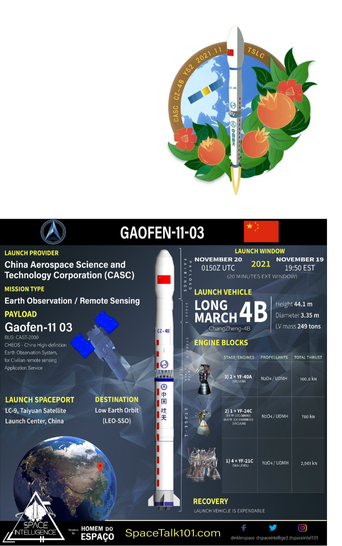 20 Nov 2021: China launched the Gaofen (GF) 11-03 imaging satellite using its Chang Zheng-4B rocket. The launch took place from the Taiyuan Satellite Launch Center. This is China’s 44th orbital mission of 2021. See Launch Video.
