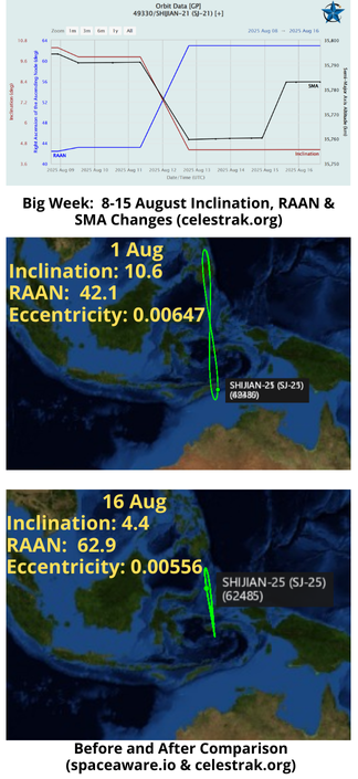 16 Aug: China conducted significant plane change maneuvers with the docked SJ-21/25 (49330 & 62485) satellites. The 2 spacecraft have presumably been docked since 2 July 2025 when they became indistinguishable from terrestrial based space domain awareness sensors (optical, radar and signal based). The pair made minor maneuvers from 2-7 Aug, then from 8 – 15 August, Chinese space operators conducted several plane-changing maneuvers which resulted in a 6° reduction of the spacecraft’s inclination and a significant change in RAAN as well. Such maneuvers are highly fuel/energy intensive (see next article) and very rare.
