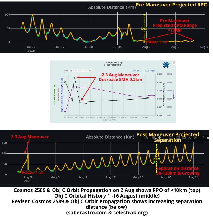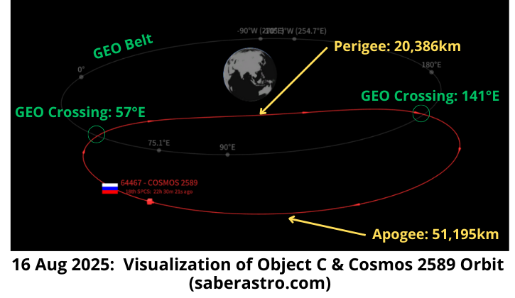 3-16 August: In the 3 Aug Flash it appeared Cosmos 2589 (64467) and Obj C (64527) were positioned to conduct <10km RPO through at least 8 Aug. However, Obj C maneuvered on ~3 Aug effectively terminating the RPO conditions and the objects have been slowly separating since that time. As of 16 Aug the two objects are between 55-130km apart with the distance slowly growing each orbit. There are yet no signs of either Cosmos 2589 (last maneuver 7 Jul) or Object C maneuvering to join the GEO belt. Both have apogees of 51,195km and perigees of 20,386km resulting in a highly eccentric orbit of 0.365. To join the GEO belt the satellites will need to lower apogee and raise perigee to ~35,786km. Both satellites cross the GEO belt twice per orbit, and could potentially image other satellites as they approach that orbital plane.