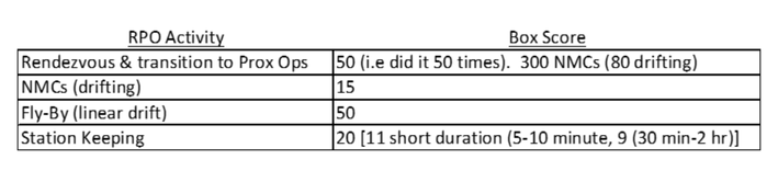 THE BOX SCORE OF AMAZING RPO ACCOMPLISHMENTS I made a table summarizing the RPO techniques they tried, demonstrated and learned as they attempted and accomplished them. They worked well within 1 Km of the upper stage, sometimes within 100 meters. Each time a tremendous effort was mounted to plan, simulate and attempt a specific goal. Sometimes it was fraught with challenges, and other times it worked fine. Such is space experimentation, it’s “like a box of chocolates, you never know what you are going to get.” (using my Forrest Gump voice). Well, actually with planning and simulation and such you can have a good idea of what you’ll get. As Clark would say “let’s run the numbers before we try.” If it’s a glitch or surprise, work it! Learn! Here’s the summary.