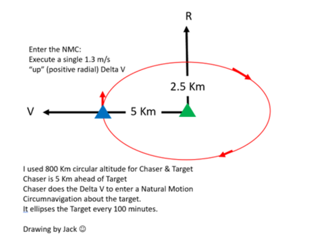 A key objective in the XSS-11 on orbit activity was to establish a natural motion circumnavigation (NMC) relative motion trajectory around the Minotaur upper stage. For those of you involved in RPO, you’ll recognize the term NMC. “It’s a household word in the RPO business” (again, using my Forrest Gump voice). Guess what? The NMC term was created in the XSS-11 program. No kidding. Here’s the story. From Mike’s account, the Draper Lab folks called the NMC pattern the “football orbit,” after all it was somewhat shaped like the planar view of an (American) football. Mike felt a better name for the “football” orbit was needed, more descriptive. Mike proposed “Natural” Motion Circumnavigation. Here’s a simple illustration of the NMC, in this case a 5km x 10 Km NMC (that happens to be shaped like a football I guess). To enter a NMC a radial delta V is what’s needed and the NMC pattern commences. Here’s my drawing and thank you Mike for your NMC idea!