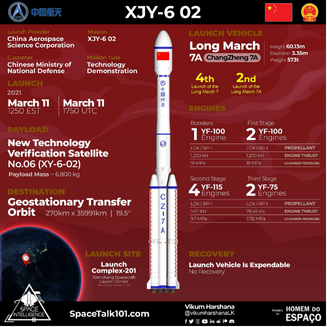 11 Mar 21: On its second attempt, China successfully launched the Long March 7A (LM-7A) from Wenchang launch facility on Hainan Island. The launch placed the Shiyan-9 experimental satellite into Geosynchronous Transfer Orbit (GTO). See Launch Video.
