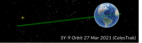 – SY-9 is currently in an elliptical, or oval-shaped, orbit ranging between 155 miles and 22,270 miles (250-by-35,840 kilometers), with an inclination of 19.5 degrees to the equator, according to independent tracking data released by the U.S. military.