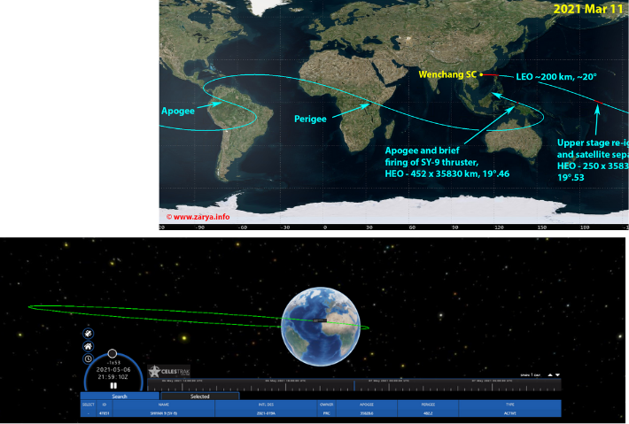 – The Shiyan-9 appeared normal through the second apogee on 12 March, near 134° east, at 1025 UTC. However the anticipated orbit correction did not occur and a continuing flow of orbit data from Space-Track over the next few days showed SY-9 remained in a transfer orbit.