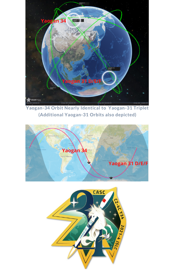 Yaogan 34’s orbit is nearly identical to that of the Yaogan-31 D/E/F triplets launched on 29 January 2021. Yaogan-31 satellites are believed to be maritime reconnaissance satellites for tracking foreign naval movements. All four satellites are inclined at 63.4° and are at nearly the same altitude (1084-1099km for Yaogan 34 & 1088-1105km for Yaogan 31 D/E/F) with an orbital period that differs by approximately 6 seconds. Without further orbital adjustments Yaogan-34 will transition to lead position on 13 May.