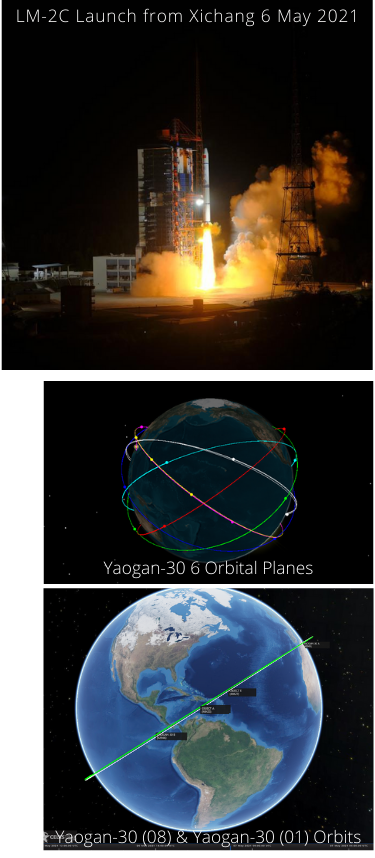 6 May 2021: China launched 3 new Yaogan 30 satellites from Xichang on a LM-2C rocket. The satellites were placed into a nearly identical orbit with 3 other Yaogan 30 satellites launched in 2017.