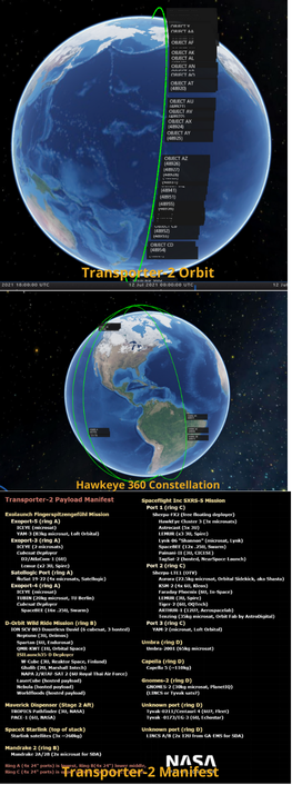 30 Jun 2021: SpaceX successfully launched 88 satellites into a 525km Sun-Synchronous orbit on their second dedicated rideshare mission, Transporter-2. On board were a number of commercial earth observation satellites: Aerospacelab, Capella, Hawkeye360, Iceye, Kleos Space, Satellogic and Umbra.