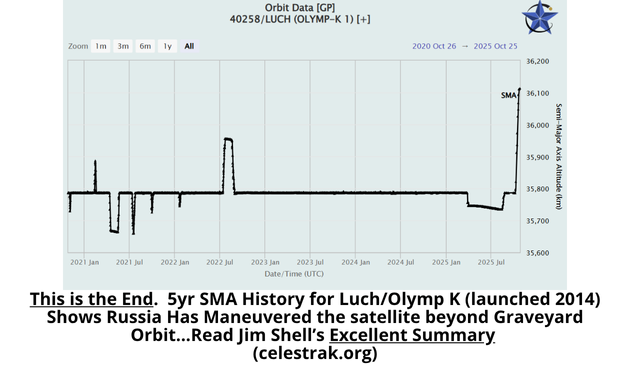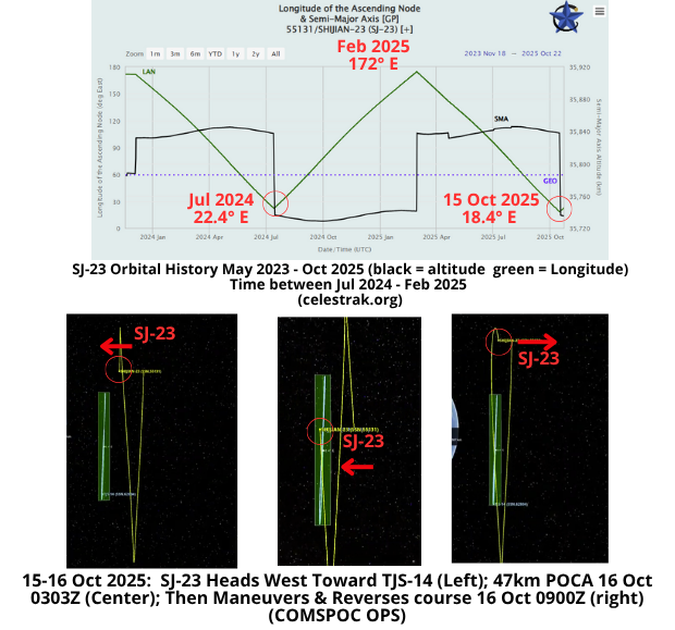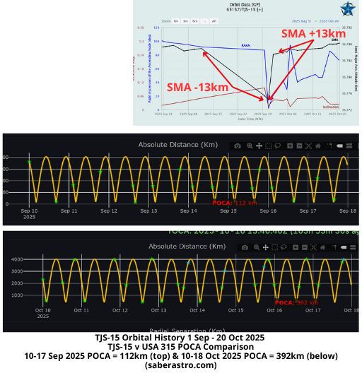 – China reduced TJS-15’s SMA ~13km from 11-30 Sep 2025. The maneuver initiated a slow eastward drift which ceased in early October when China increased TJS-15’s SMA ~13km to rejoin the GEO belt.